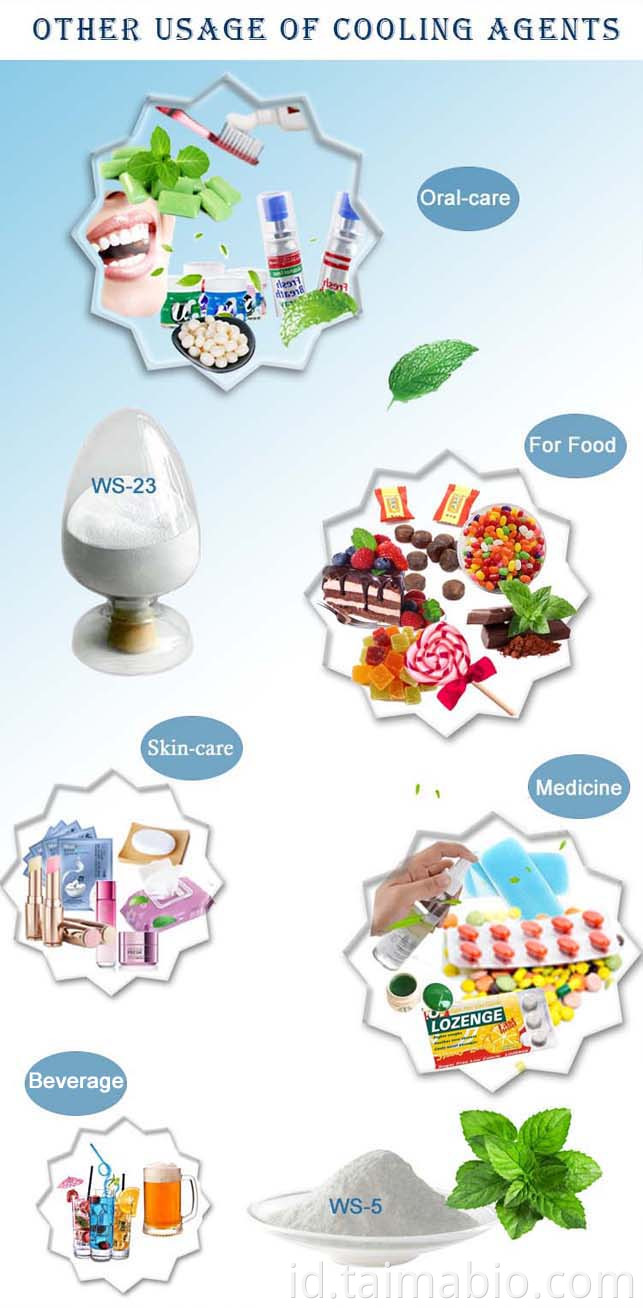 3. It has stronger and longer-lasts of cool-feeling than menthol; 4.The dosage of cooling agent is much lower than menthol, for v is 30ppm-100ppm(Mix ratio: 0.03% -0.1%); 5. Most importantly, it is affordable. |