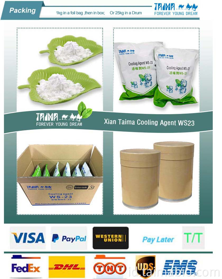 Kemasan: Harga Pabrik Taima WS-23 Paket Bubuk Pendingin Bubuk WS-23 Paket Sampel Rasa Cool 20g; Paket standar 1 kg; Paket 500g sesuai dengan permintaan pelanggan; 1kg/drum; 5kg/drum; 25kg/drum; 10kg/karton; 25kg/karton; 50kg/karton
